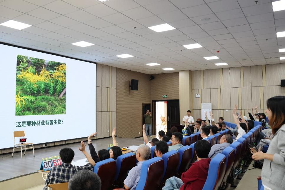 知识竞赛决赛采用PPT答题形式,分为必答题、抢答题和开放式问答三个环节。必答题环节中,各队稳扎稳打,比分始终紧咬;抢答题环节,选手们眼疾手快,频频按响抢答器,现场气氛紧张而热烈;开放式问答环节,各队围绕“如何有效防控松材线虫病入侵校园及周边林区”等议题,提出了多项创新思路,赢得评委与观众的阵阵掌声。